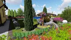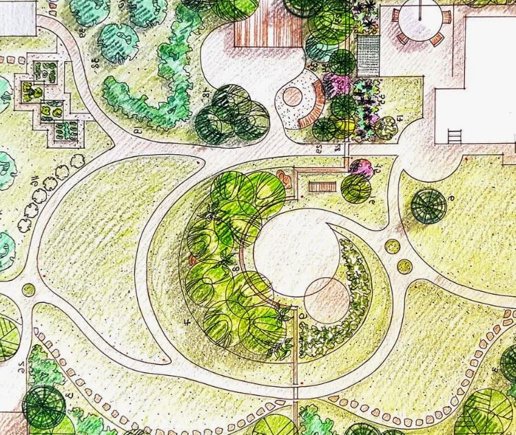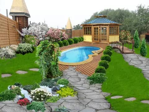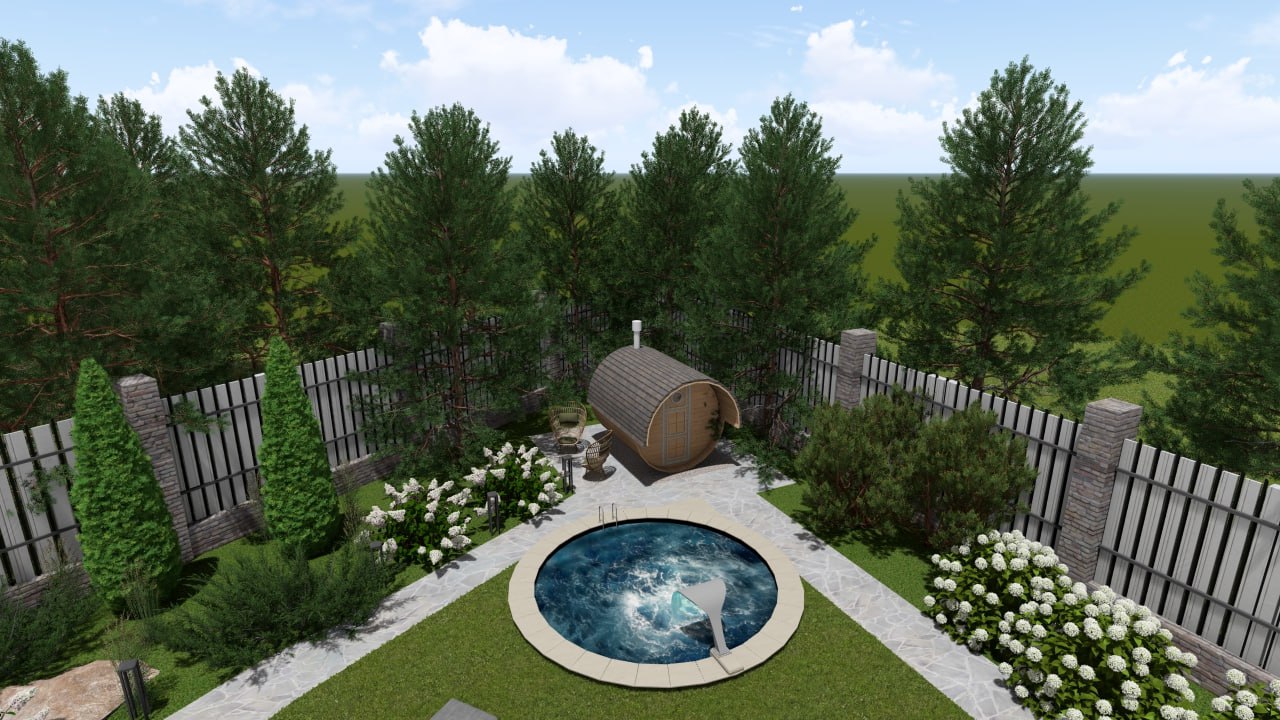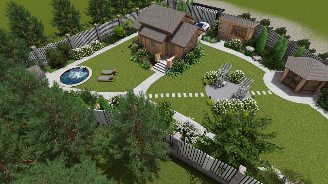 Разделите участок на 3–4 зоны, чтобы избежать перегруженности (дом и отдых — до 25% площади).